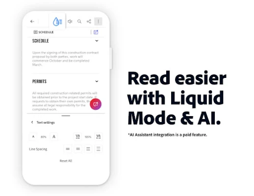 Acrobat Reader îți oferă flexibilitate maximă printr-o gamă extinsă de instrumente. Completează și semnează documente cu ușurință folosind funcția gratuită Fill & Sign, transformând procesele birocratice. Beneficiază de modul Liquid, care optimizează vizualizarea PDF-urilor, adaptând conținutul ecranului tău pentru o lectură impecabilă, cu posibilitatea de a ajusta dimensiunea fontului și spațierea. Adaugă adnotări, comentarii sau evidențieri pentru a sublinia informațiile cheie. Poți, de asemenea, să-ți asculți documentele PDF oriunde te-ai afla, o funcție excelentă pentru suportul lecturii. Gestionează fișierele cu agilitate, integrând conturi de stocare online precum Google Drive, Microsoft OneDrive și Dropbox, și marchează documentele importante pentru acces rapid. Acrobat Reader este conceput pentru a fi hub-ul tău digital complet, disponibil pe toate platformele și adaptat pentru a simplifica fiecare aspect al fluxului tău de lucru cu PDF-uri.