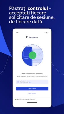 Cu QuickSupport, oferit de TeamViewer, aveți la îndemână soluția ideală pentru a primi asistență tehnică rapidă și eficientă. Conectați-vă fără efort cu partenerul dumneavoastră de încredere, permițându-i să ofere suport IT la distanță, să gestioneze setările Wi-Fi, să vizualizeze informații esențiale despre dispozitiv și să schimbe fișiere bidirecțional. Fie că aveți nevoie de ajutor cu o problemă tehnică sau doriți să partajați documente importante, QuickSupport transformă complexitatea în simplitate, aducând expertiza necesară direct pe dispozitivul dumneavoastră, indiferent de platforma de pe care inițiază conexiunea partenerul.