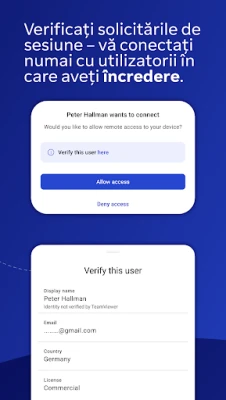 Securitatea este o prioritate absolută, iar TeamViewer se angajează să vă protejeze datele. QuickSupport utilizează cele mai înalte standarde de criptare AES pe 256 de biți pentru fiecare sesiune, asigurându-vă că fiecare conexiune este complet securizată. Controlul rămâne în permanență la dumneavoastră: accesul la dispozitiv este acordat exclusiv cu permisiunea dumneavoastră explicită, iar sesiunile pot fi demarate sau încheiate oricând doriți. Mai mult, aplicația vă permite să verificați identitatea partenerului, afișând detalii precum numele, adresa de e-mail și tipul de licență, garantând că interacționați doar cu persoanele în care aveți încredere. Pur și simplu lansați aplicația, partajați ID-ul sau introduceți un cod de sesiune, și sunteți gata de conectare, cu acceptul dumneavoastră prealabil.